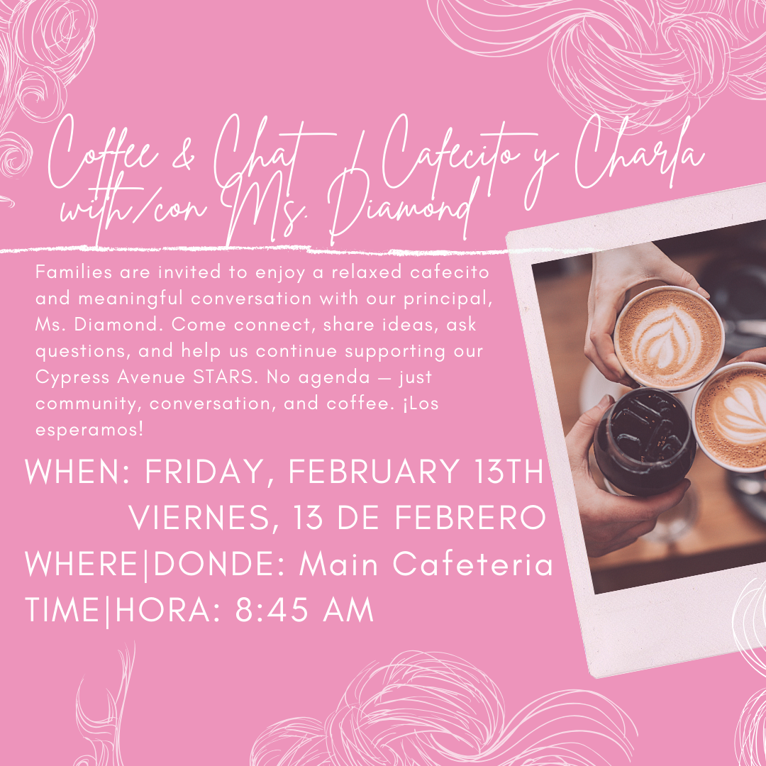 Families are warmly invited to join us for Coffee & Conversation with the Principal on Friday, February 13. This is a wonderful opportunity to enjoy a cup of coffee, connect with other families, and share ideas, thoughts, and questions with our principal, Ms. Diamond. We look forward to meaningful conversations and strengthening our school community together. ☕🤍