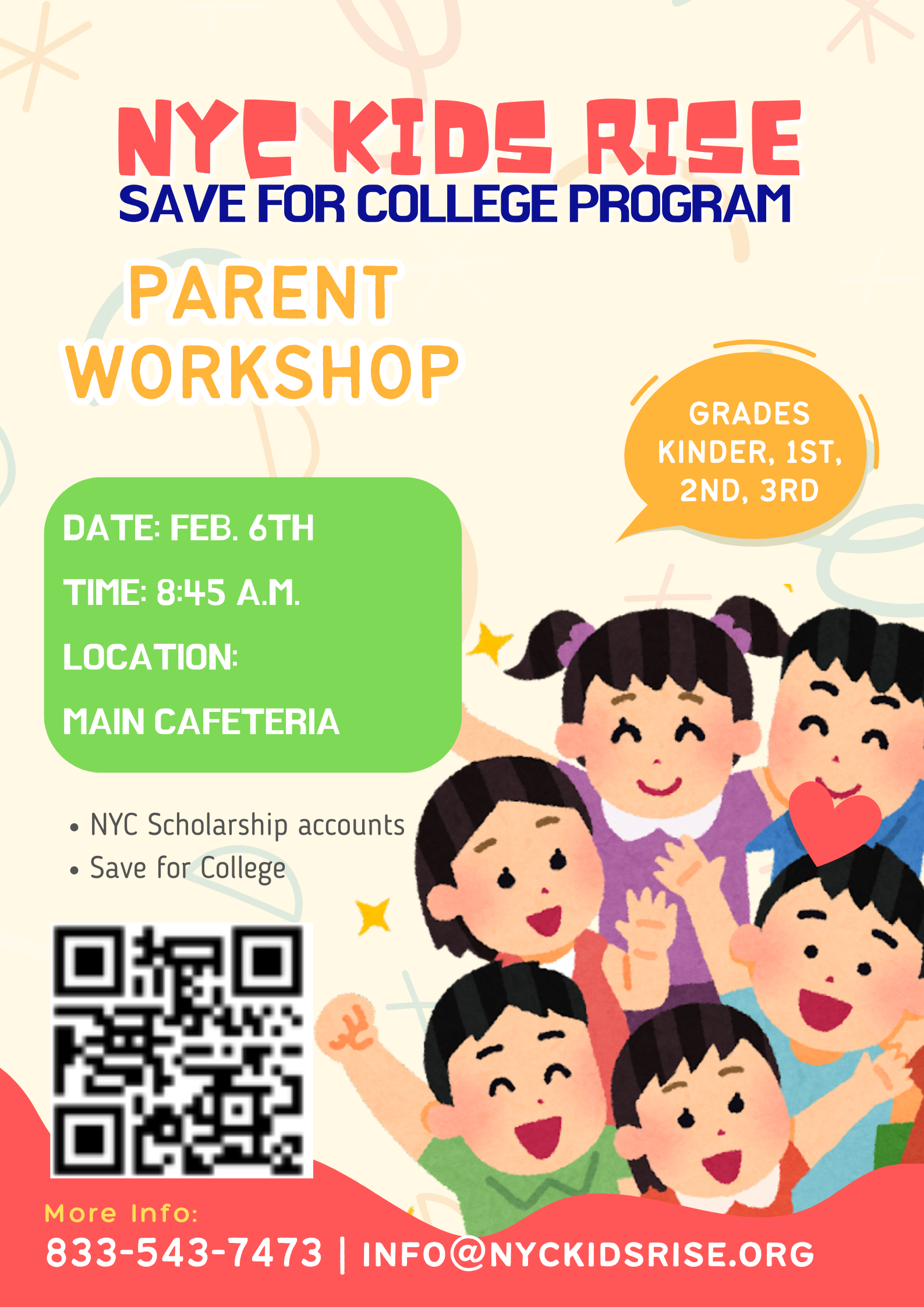 Families are invited to attend a Parent Workshop at PS 81 Q on February 6 to learn about NYC Kids RISE – Save for College, a free program that helps families build a foundation for their child’s future education. This workshop is designed for families of Kindergarten through 3rd Grade students and will provide helpful information about how the program works, the benefits for your child, and ways to get involved. We encourage all eligible families to join us for this important and informative session.